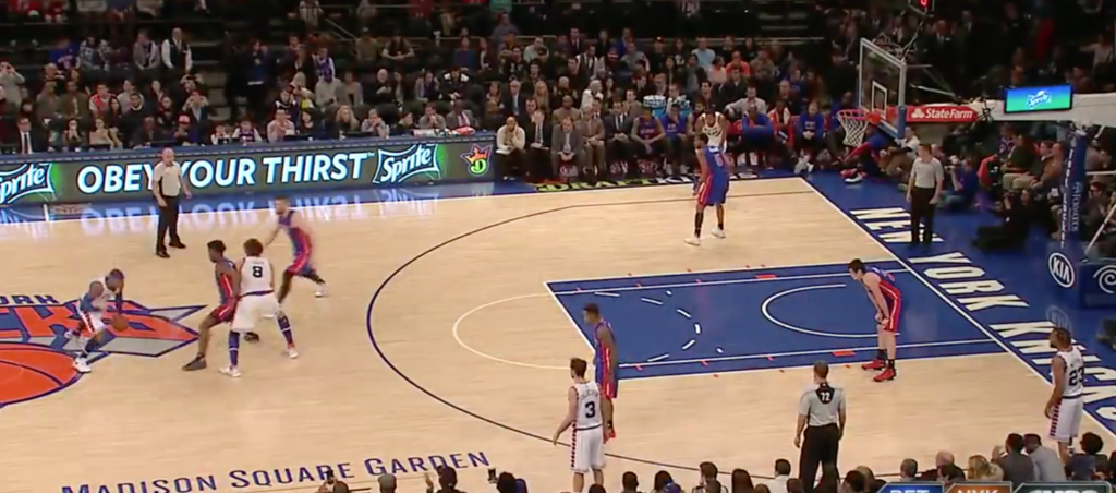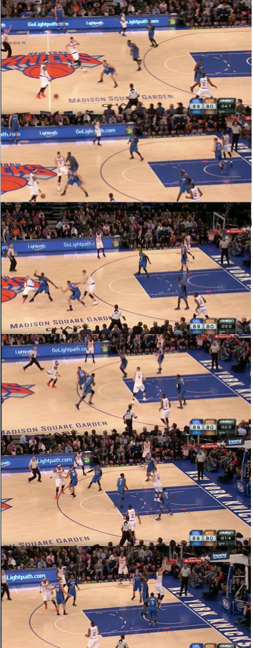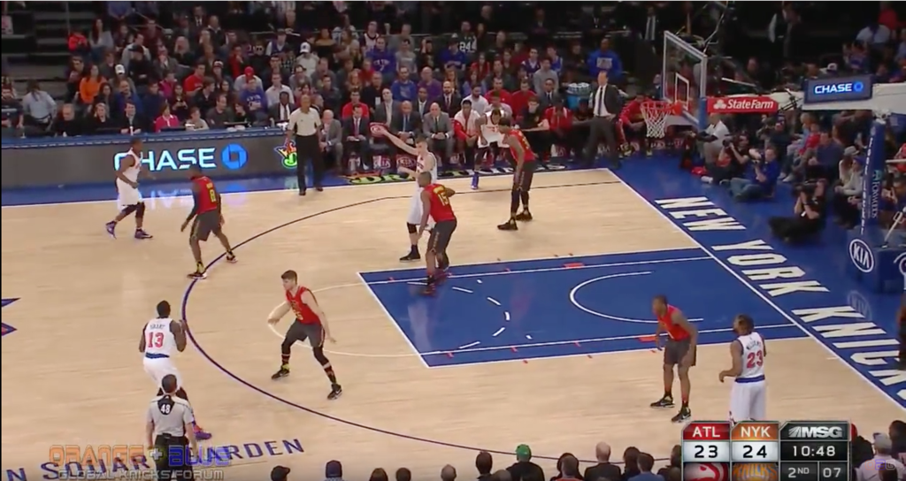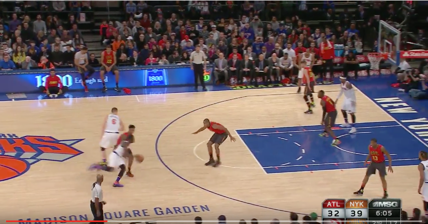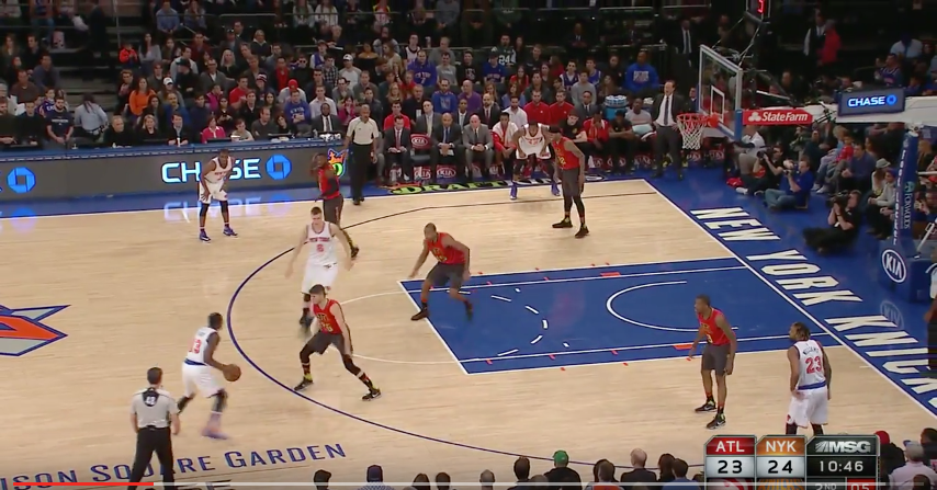 This is the play that the Knicks have run successfully that most mimics the spread offenses of other teams, but in truth is comes out of the Triangle spacing, but since the big, in this case KP doesn't rush to the post but instead sets a Drag screen it's actually a bit different from how other teams run it.