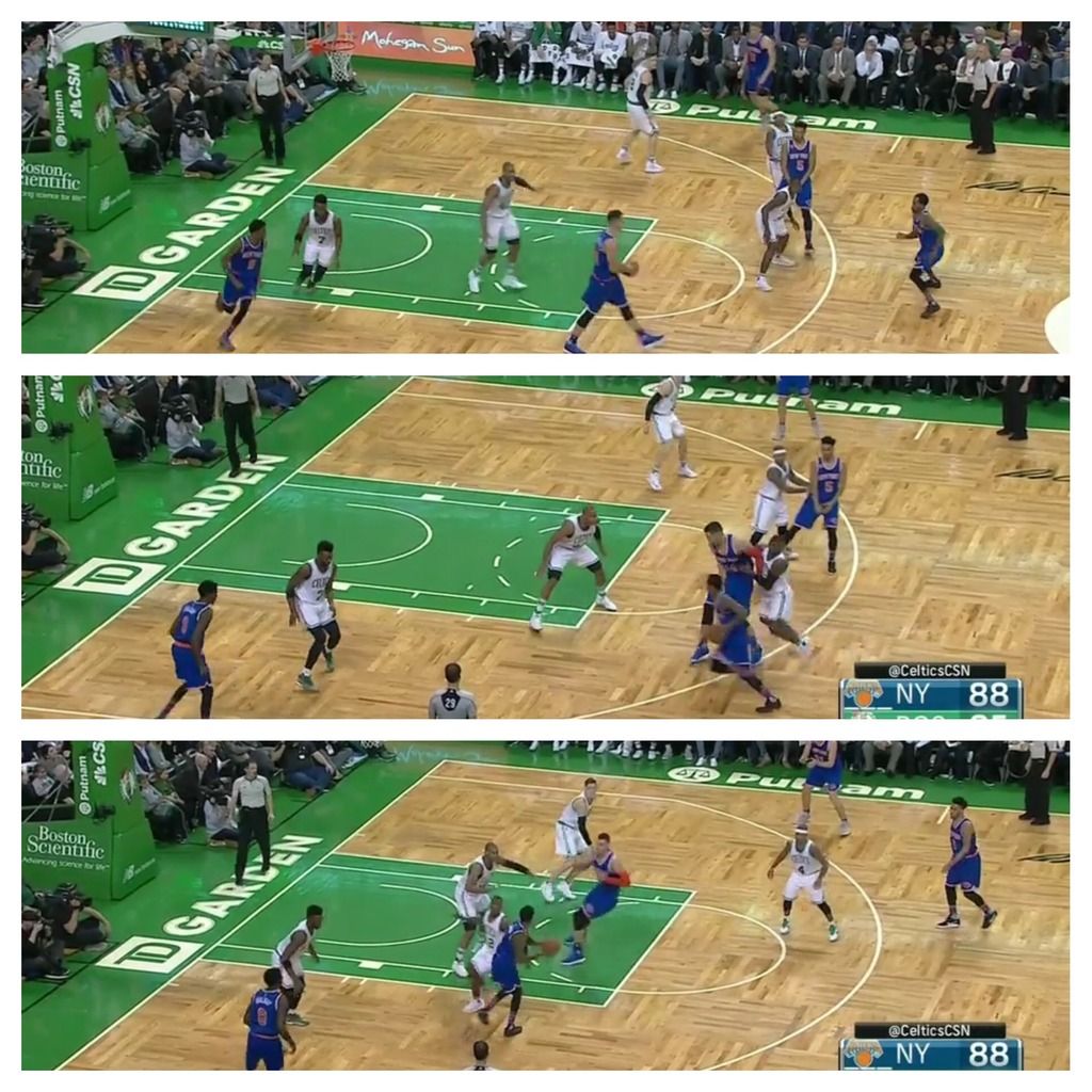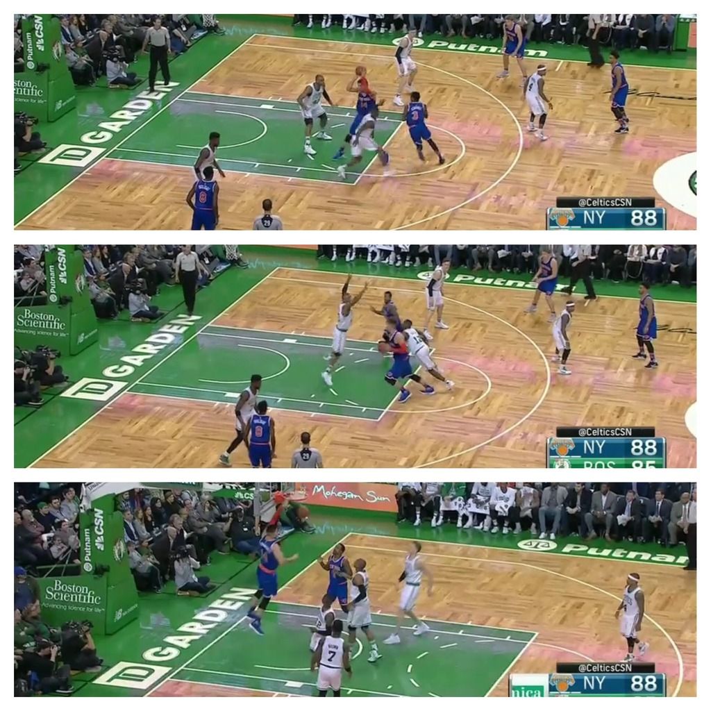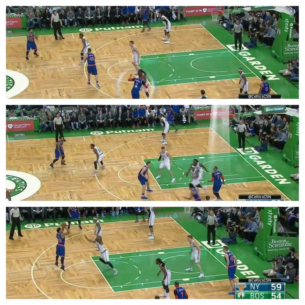 In terms of the amount of Triangle the Knicks were playing, I can tell you that they were in FACT running more Triangle previous to the last 2 games and I even posted example from the Sixers game. These examples show the Triangle Spacing and not the 4 Out spacing they've since been featuring more often:
