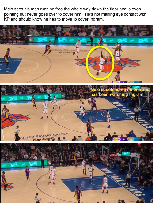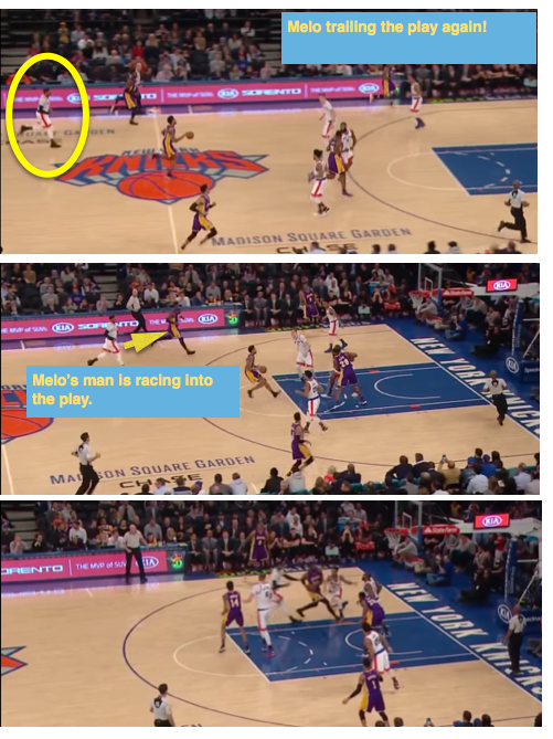 I am glad you showed these Melo defensive misqueues. I watched the game and saw the same thing. He does it all the time. Mostly right after he shoots whether it goes in or not. I can get kind of understand if it misses but on a make he is still slow getting back which makes the entire team off balance on D. It happens every game 10-15 times.