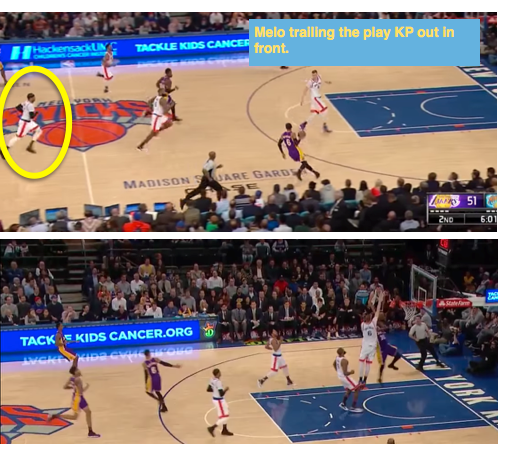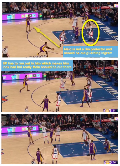 nixluva wrote:I know there has been a lot of back and forth about the impact of Rose and Melo on KP and the team in general, so I wanted to do one of my usual Breakdowns to highlight the points I've been trying to make. It's not JUST Rose and Melo but they are the BIGGEST sources of the lack of ball and player movement and stagnation. This leads to lower energy and bad shooting from the rest of the team. ON top of that the lack of D from Rose and Melo simply makes it even worse.Here is a set that is supposed to be a version of my favorite KP play but rather than having Kuz as the Post player and Sasha setting a great pick, we have Melo in the Post and KOQ setting the Pindown for KP. It was HORRIBLE. Melo never waits and looks to pass. He goes right into his post move and KOQ's Screen is OK but his man is able to get back out to KP since Melo doesn't deliver the pass. Also Rose's lack of 3pt threat allows his man to slip into the paint.