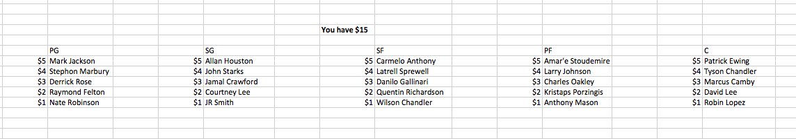 Stephon Marbury ($4), Allan Houston ($5), Wilson Chandler ($1), Kristaps Porzingis ($2) and Marcus Camby ($3)