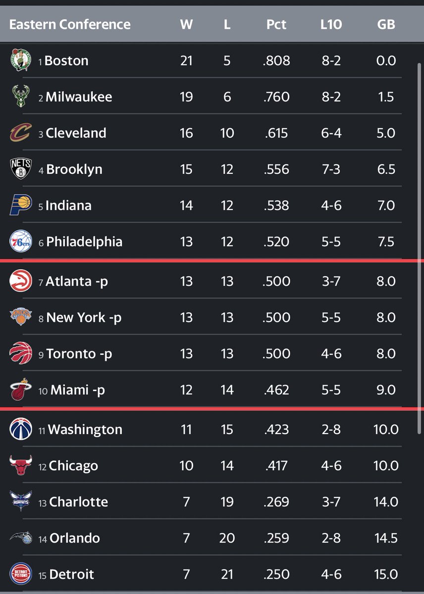 KnickDanger wrote:Top 4 seem likely to stay in place. Wiz and Bulls seem to be joining the tank brigade. Five through ten looks topsy turvy and Knicks could conceivably land anywhere in there. Injuries, trades, drama are outside forces for all involved.