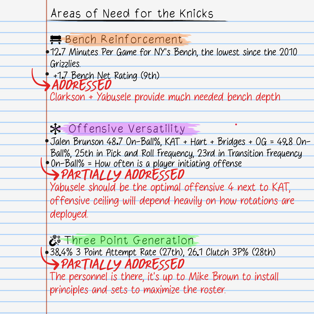 The Knicks added 2 proven contributors to their bench, including a top 10 transition player in basketball last season, Guerschon Yabusele. They are poised to be more resilient offensively, providing Mike Brown can deploy their pieces more effectively.
